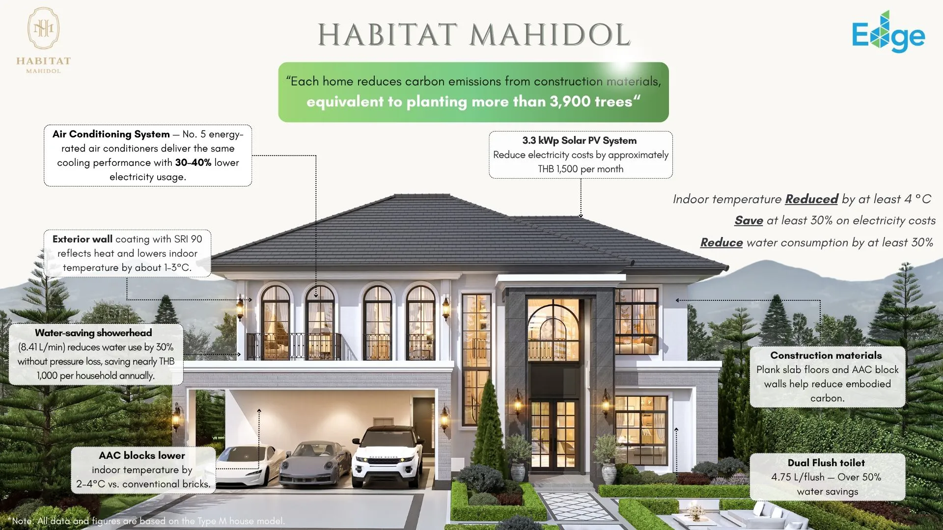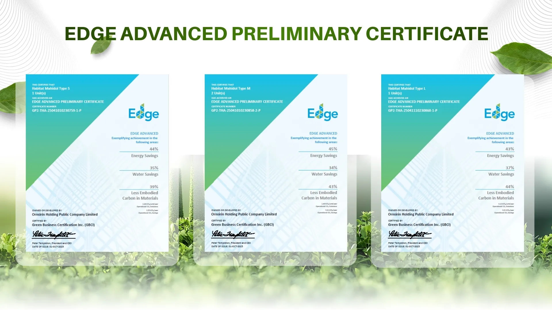 จึงนำแนวทางการออกแบบอาคารที่เป็นมิตรต่อสิ่งแวดล้อมมาใช้ โดยคำนึงถึงผลกระทบตลอดวงจรชีวิตของอาคาร (Life Cycle Assessment: LCA) ตั้งแต่การเลือกใช้วัสดุไปจนถึงการก่อสร้าง เพื่อส่งเสริมการใช้ทรัพยากรอย่างมีประสิทธิภาพ ลดของเสีย และลดการปล่อยก๊าซเรือนกระจก จึงได้นำ มาตรฐานอาคารเขียว EDGE (Excellence in Design for Greater Efficiencies) มาใช้เป็นแนวทางหลักในการพัฒนาโครงการ เพื่อยกระดับประสิทธิภาพด้านพลังงาน น้ำ และวัสดุ และลดการใช้ทรัพยากรอย่างเป็นรูปธรรม แนวทางดังกล่าวถูกบูรณาการในทุกขั้นตอนของการดำเนินงาน ตั้งแต่การออกแบบโครงการ การก่อสร้าง ไปจนถึงการอยู่อาศัย เพื่อสร้างสมดุลระหว่างคุณภาพชีวิตของผู้อยู่อาศัยและการดูแลสิ่งแวดล้อมในระยะยาว